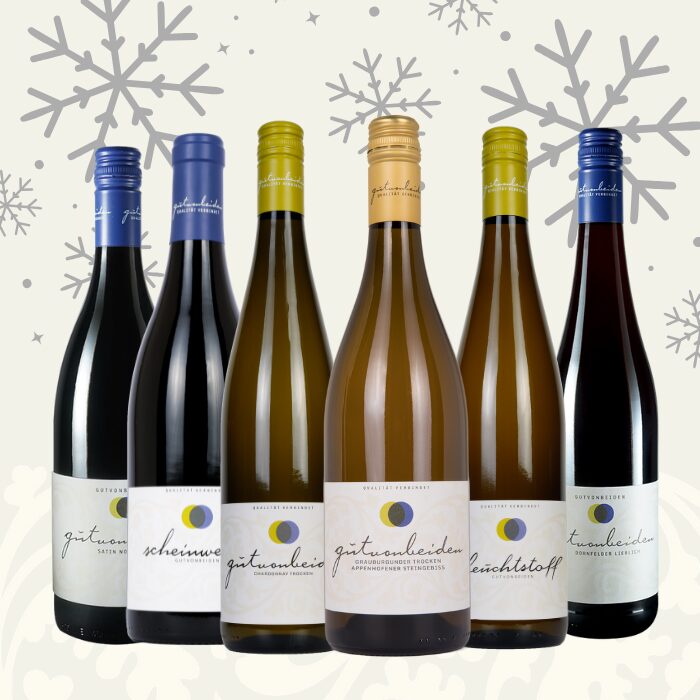 Winterlicher Weißwein No. 2: LEUCHTSTOFF – unser Bukett-Cuvée aus Muskateller, Gewürztraminer und Kerne. Durch die perfekt eingebundene Fruchtsüße bleibt der Wein noch lange im Mund erhalten.